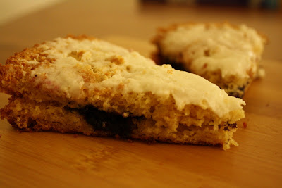 When cake is completely cooled, spread a thin layer of vanilla icing across the top. Serve with extra blueberry sauce or some fresh blueberries if you come by them.