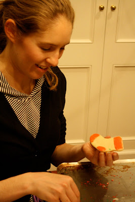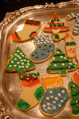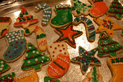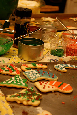 Friday evening, Cara and I showed up at the Kenners’ to offer our helpful hands. We thought, perhaps, the tasks ahead of us might involve browning 30 pounds of beef, peeling a large bag full of potatoes, or juicing lemon upon lemon for the squares, and we came prepared for blisters and exhaustion. Unsurprisingly though, given her all-powerful planning genius, complete with shopping lists from the last ten years, Barb had done almost all the work before we got there. The stew was simmering in the oven, the lemon bars were sitting on a beautiful glass platter, and all that was left for us to do was decorate the Christmas cookies.